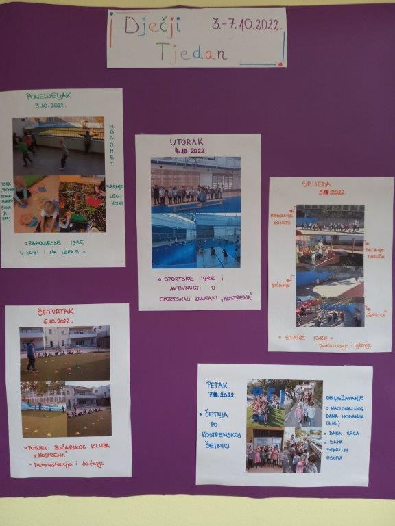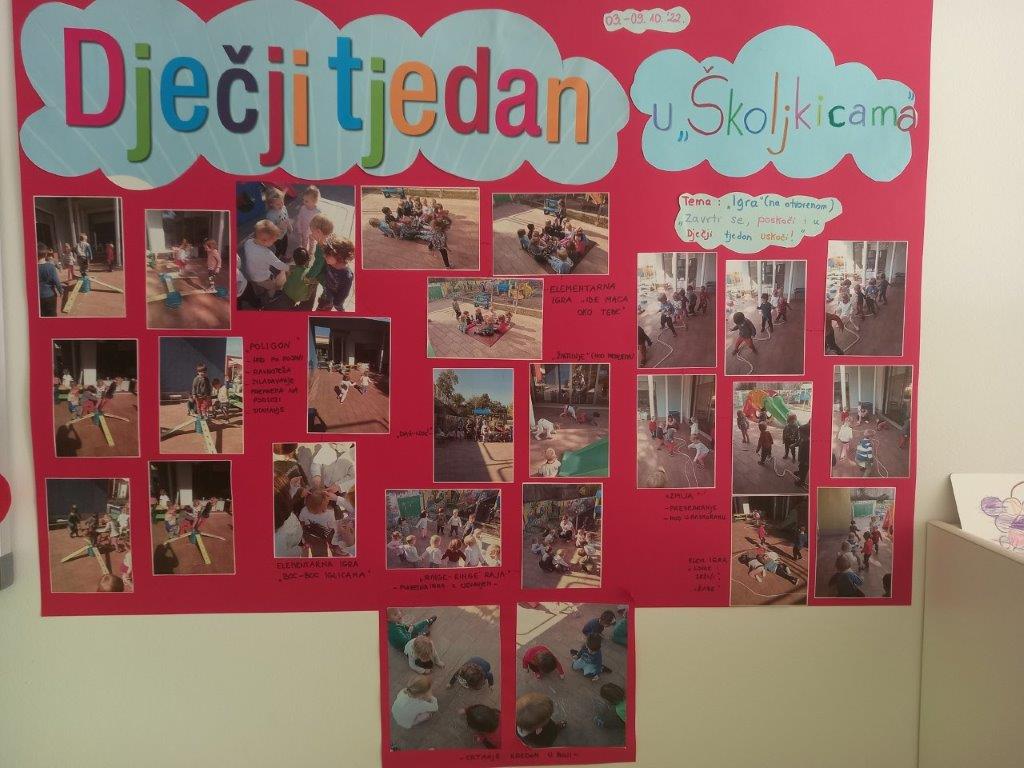 Ovogodišnje aktivnosti Dječjeg tjedna u vrtiću provodile su se pod nazivom “Zavrti se, poskoči i u Dječji tjedan doskoči!” te su obilježile početak listopada. Cilj je je bio potaknuti djecu da se igraju i kreću na otvorenom, daleko od ekrana mobitela, a da se u njihove aktivnosti aktivno uključi i zajednica. Tako smo, s idejom poticanja zajedničkog druženja, igre i učenja ostvarili navedene aktivnosti: