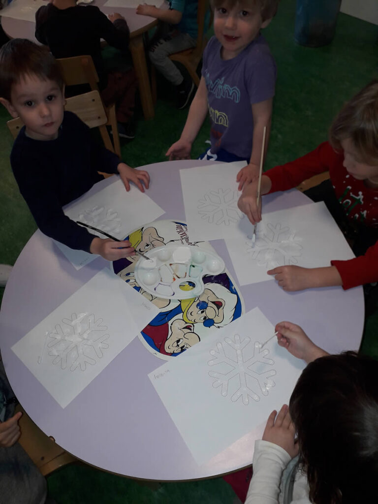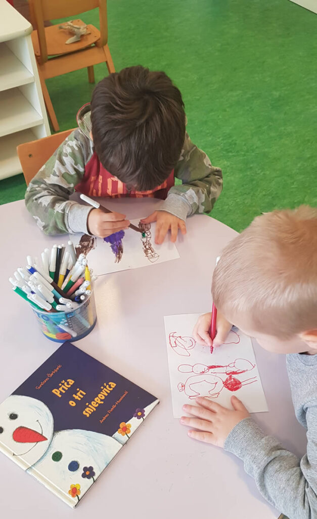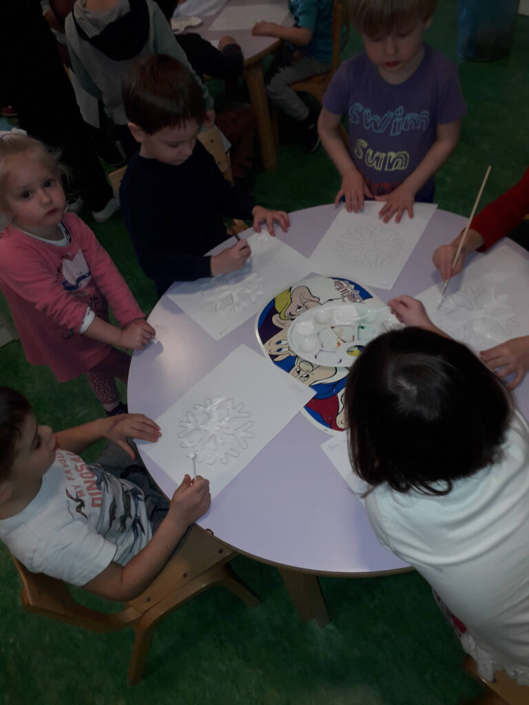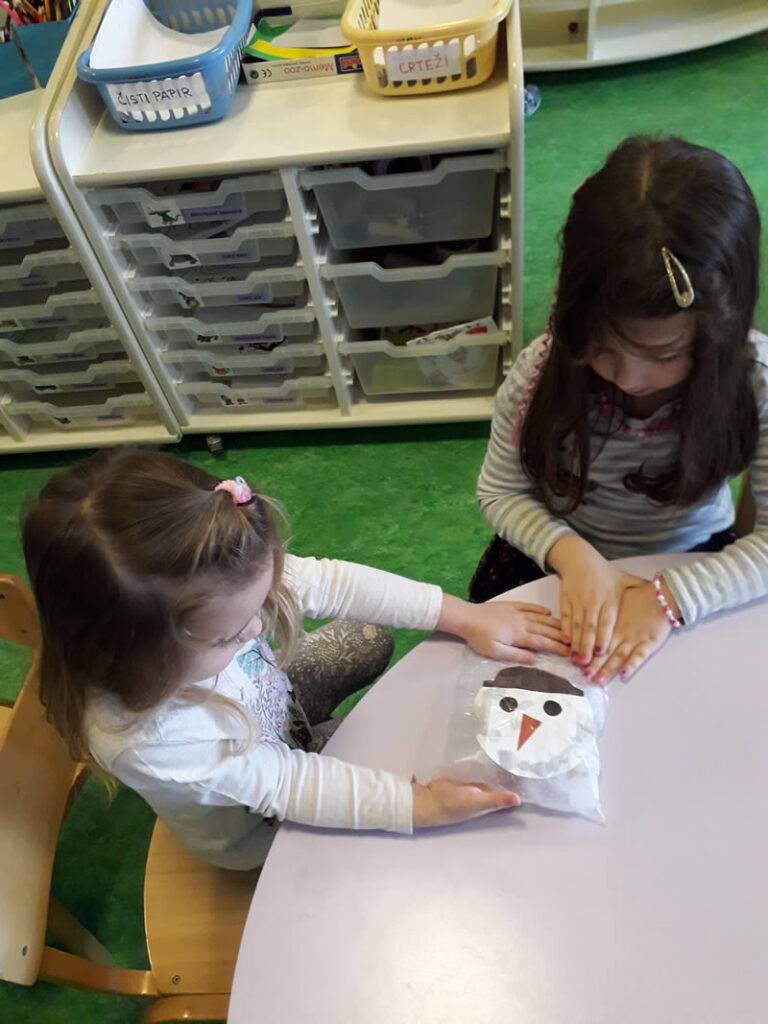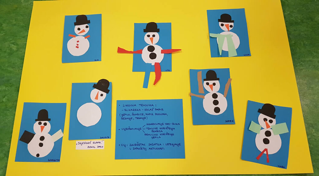 - likovne aktivnosti: kolaž “Snjegović”, ilustracije doživljaja nakon pročitanih priča i izrada pahuljice/snješka od papirnatih ručnika, popunjavanje predloška bojom