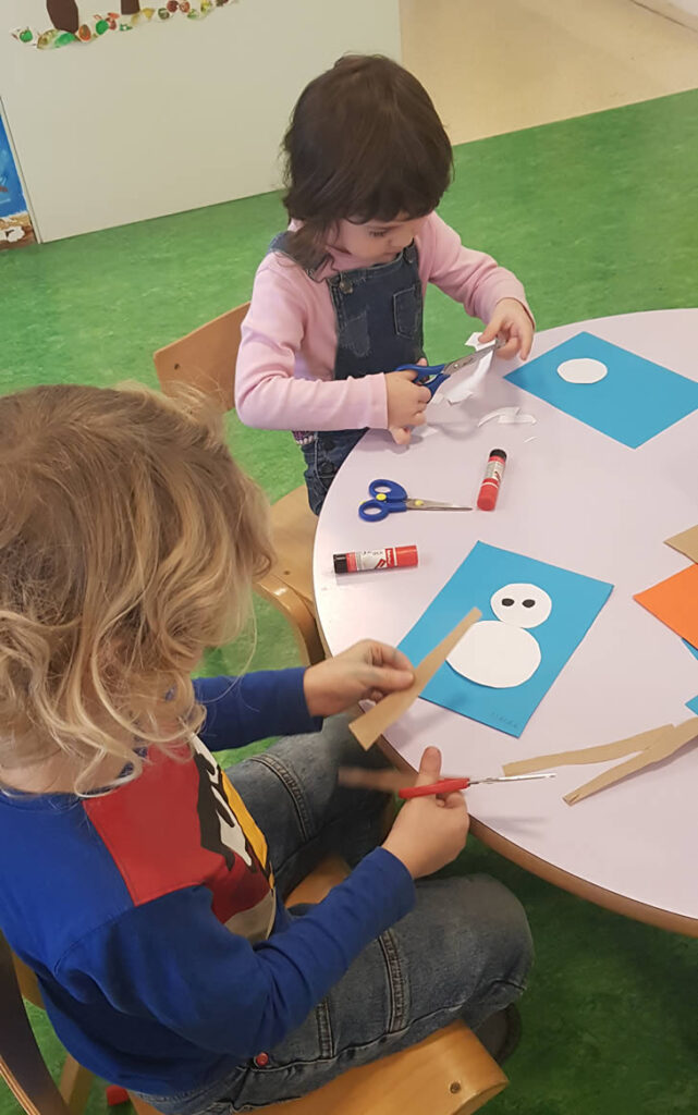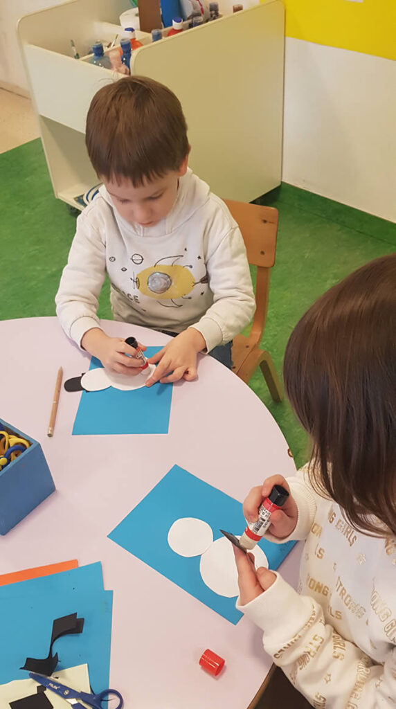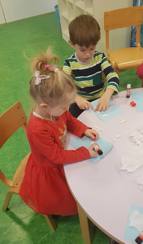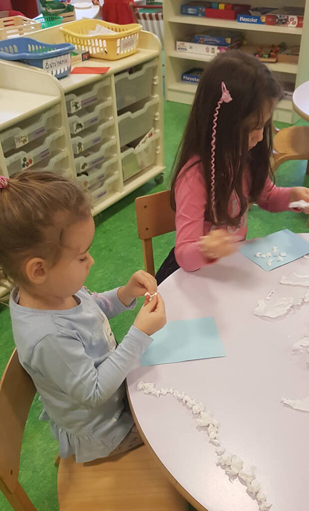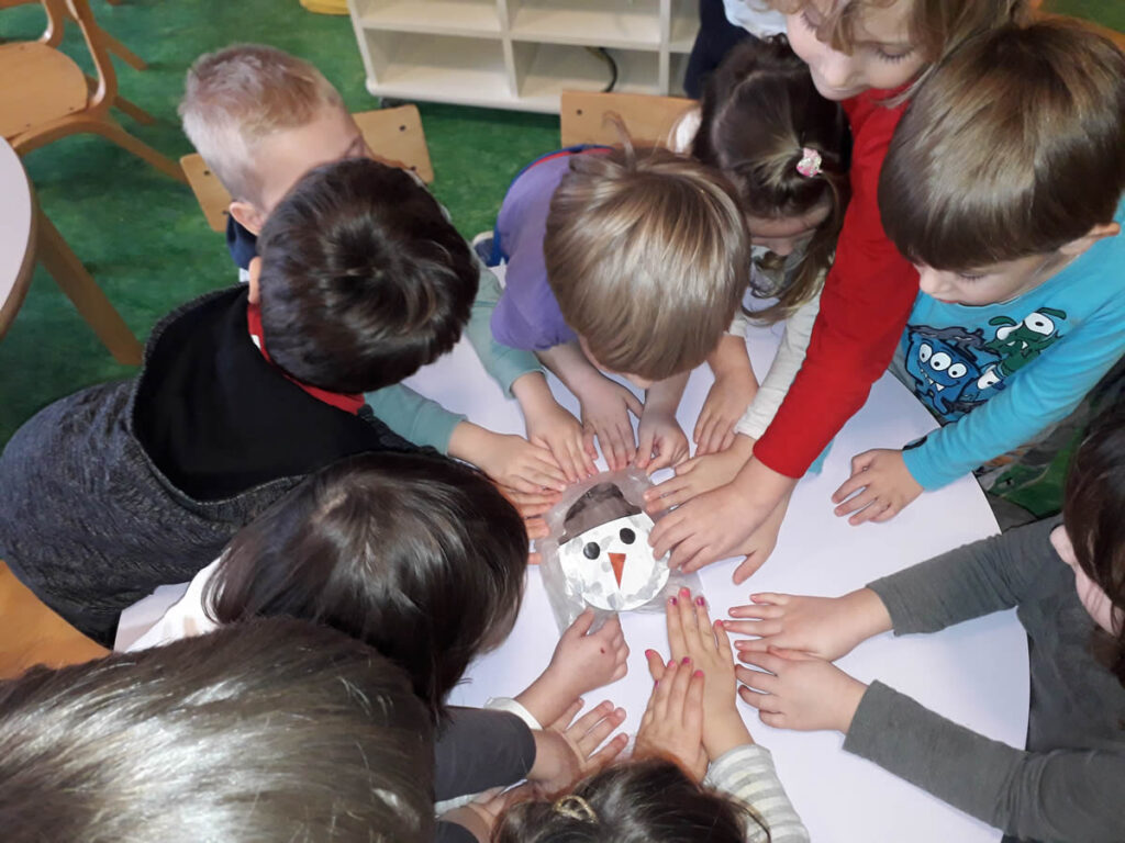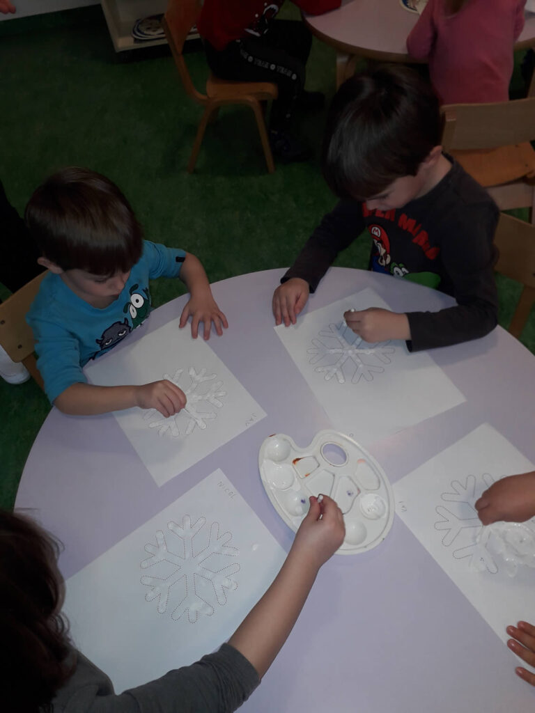 - likovne aktivnosti: kolaž “Snjegović”, ilustracije doživljaja nakon pročitanih priča i izrada pahuljice/snješka od papirnatih ručnika, popunjavanje predloška bojom