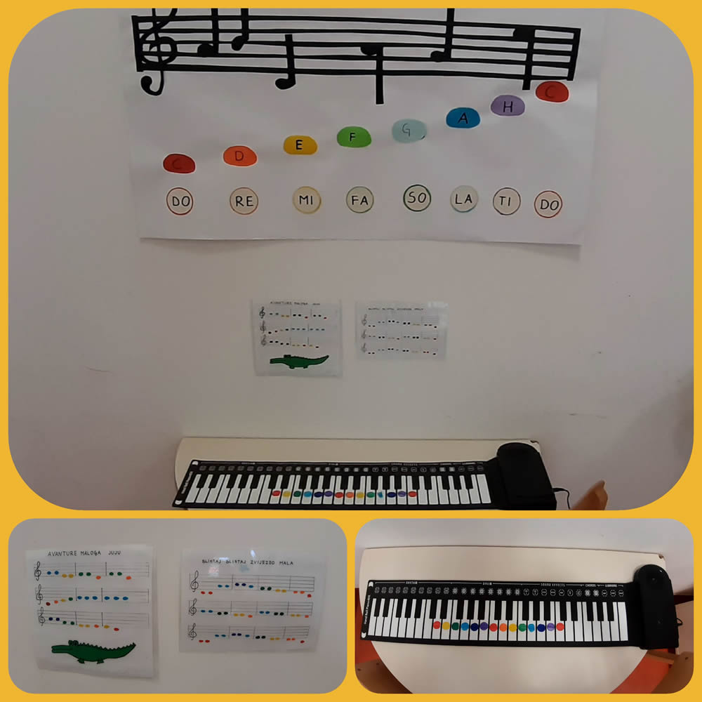Sve smo to popratili pjesmicama na temu zime. U našem novo formiranom centru za glazbene aktivnosti usvajamo nove stihove “Snjegović” i “Zima”. Djeca pokazuju interes za glazbene instrumente te i sami pokušavaju svirati.