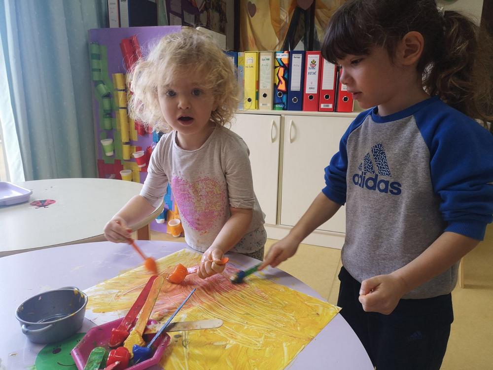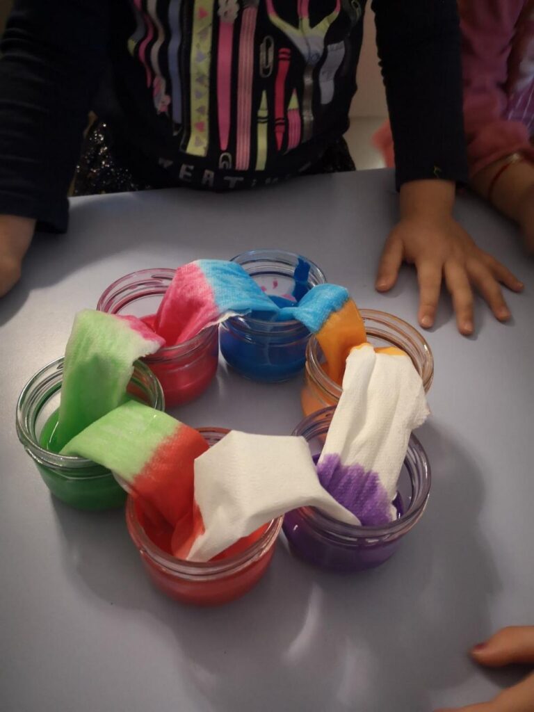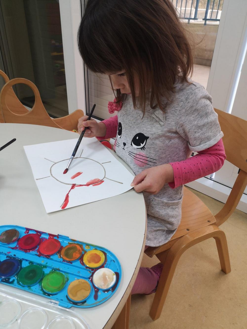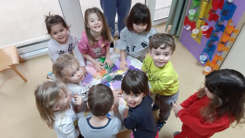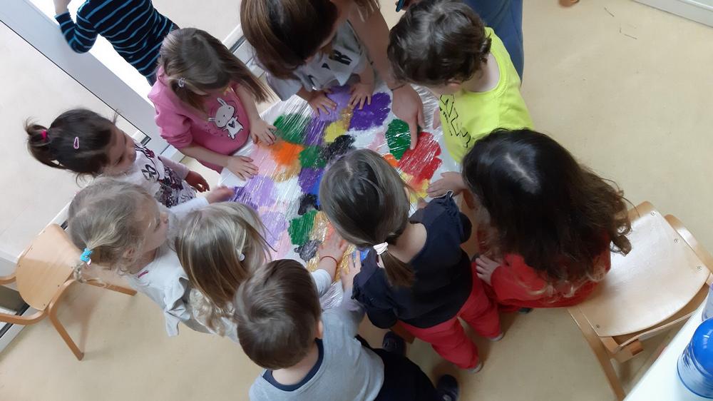 Likovno stvaralaštvo ima veliku ulogu u savladavanju teme o bojama. Otiskivali smo dlanove i stopala, slikali prstićima, bojali vodenim bojama i temperama. Tako su nastali naši leptiri i duga. Zanimljivo nam je bilo slikati prstima preko prozirne folije gdje se boje miješaju, a ruke ostaju čiste. Oslikavanje pjenom probudilo je veliku znatiželju jer su prilikom nanošenja pjene nastali radovi ostali neravni i dobili treću dimenziju.