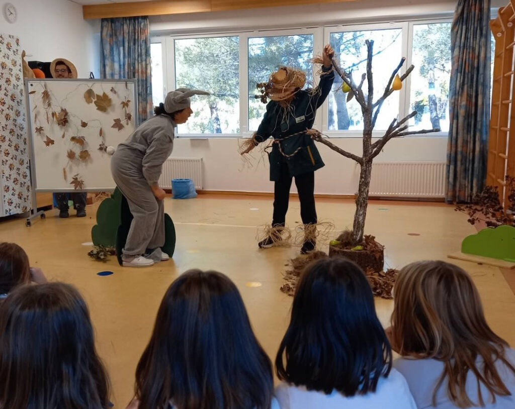 I za kraj, želimo vam reći kako je jesen polako stigla u naš vrtić i u našu sobu. U petak ( 23. rujna ) , na prvi dan jeseni, naše odgajateljice Sonja i Sandra te ravnatelj Stanko iznenadili su nas predstavom o neobičnom prijateljstvu koje se baš zbilo jedne jeseni…